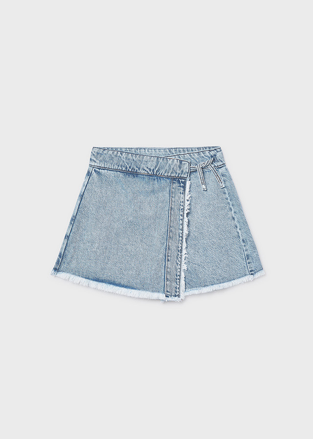 Mayoral gombos, állítható derekú farmer nadrágszoknya rojtos szárral. Igazi nyári, különleges darab, egy pólóval vagy toppal is tökéletes választás lehet a meleg napokra.