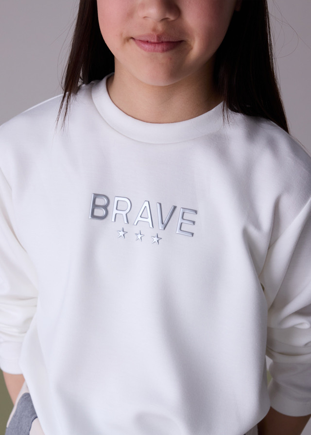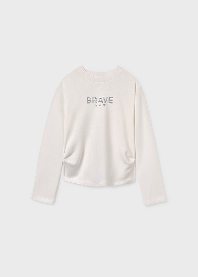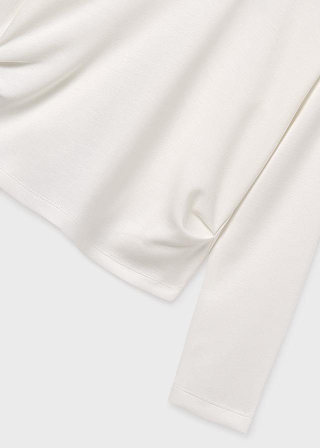 Mayoral kerek nyakkivágású nagyon puha tapintású hófehér felső, alul enyhén húzott, az elején ezüst színű felirattal. Nagyon kényelmes viselet, tökéletesen mutat egy farmerrel.