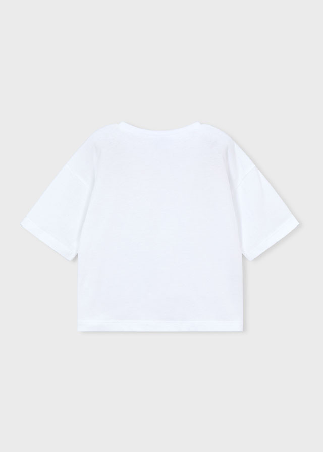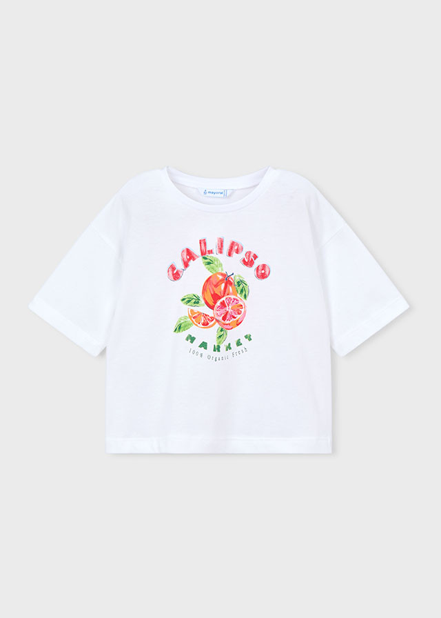 Mayoral kerek nyakkivágású laza szabású rövid ujjú póló gyümölccsel az elején, igazi nyári darab.Tökéletes bármilyen rövid-és hosszúnadrággal is.