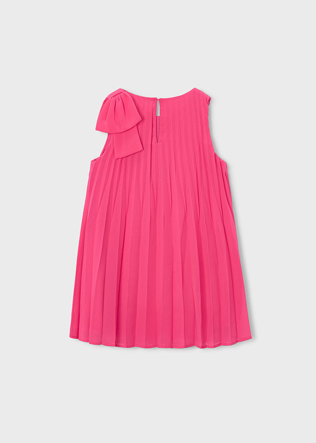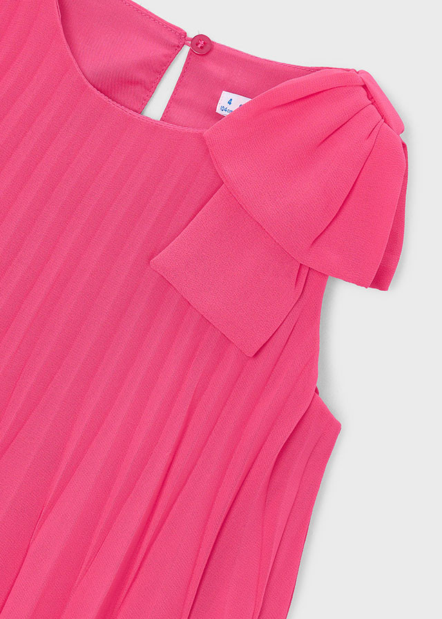 Mayoral vállpántos A vonalú pink plisszírozott ruha, egyik vállán masnival díszítve, hátul egy gombbal záródik. Laza és könnyed nyári alkalmi ruha.