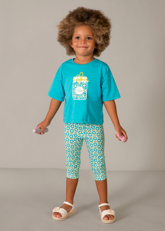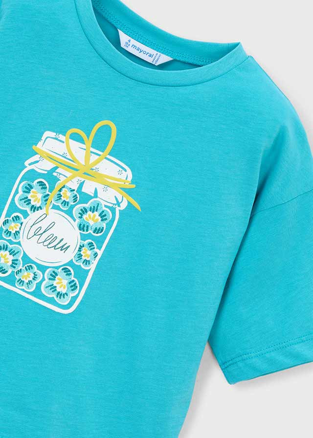 Mayoral kerek nyakkivágású bővebb szabású, rövid derekú póló mintával az elején, mely tökéletes választás egy farmer rövidnadrággal.