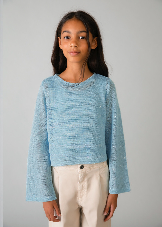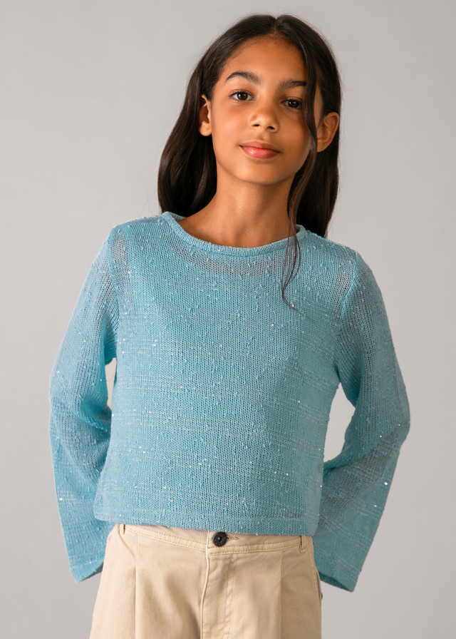 Mayoral két részből álló szett, melynek tartalma egy türkiz színű vállpántos top és egy kerek nyakkivágású átlátszó, kötött felső apró flitterekkel díszítve.