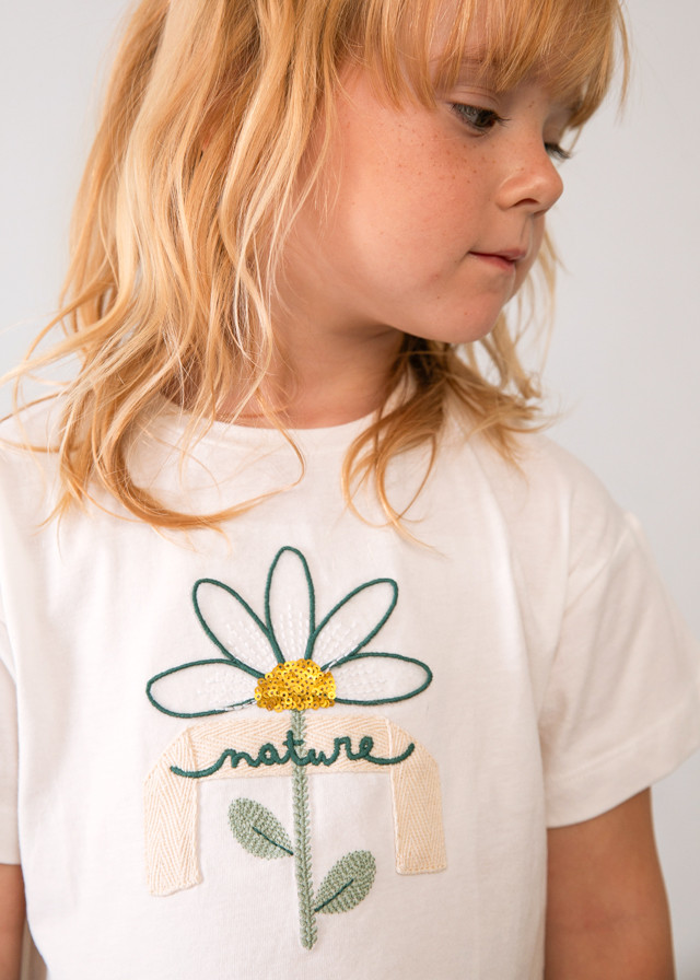 Mayoral két részes szett, melynek tartalma egy gumis derekú virágmintás leggings és egy kerek nyakkivágású rövid ujjú, elöl mintás póló